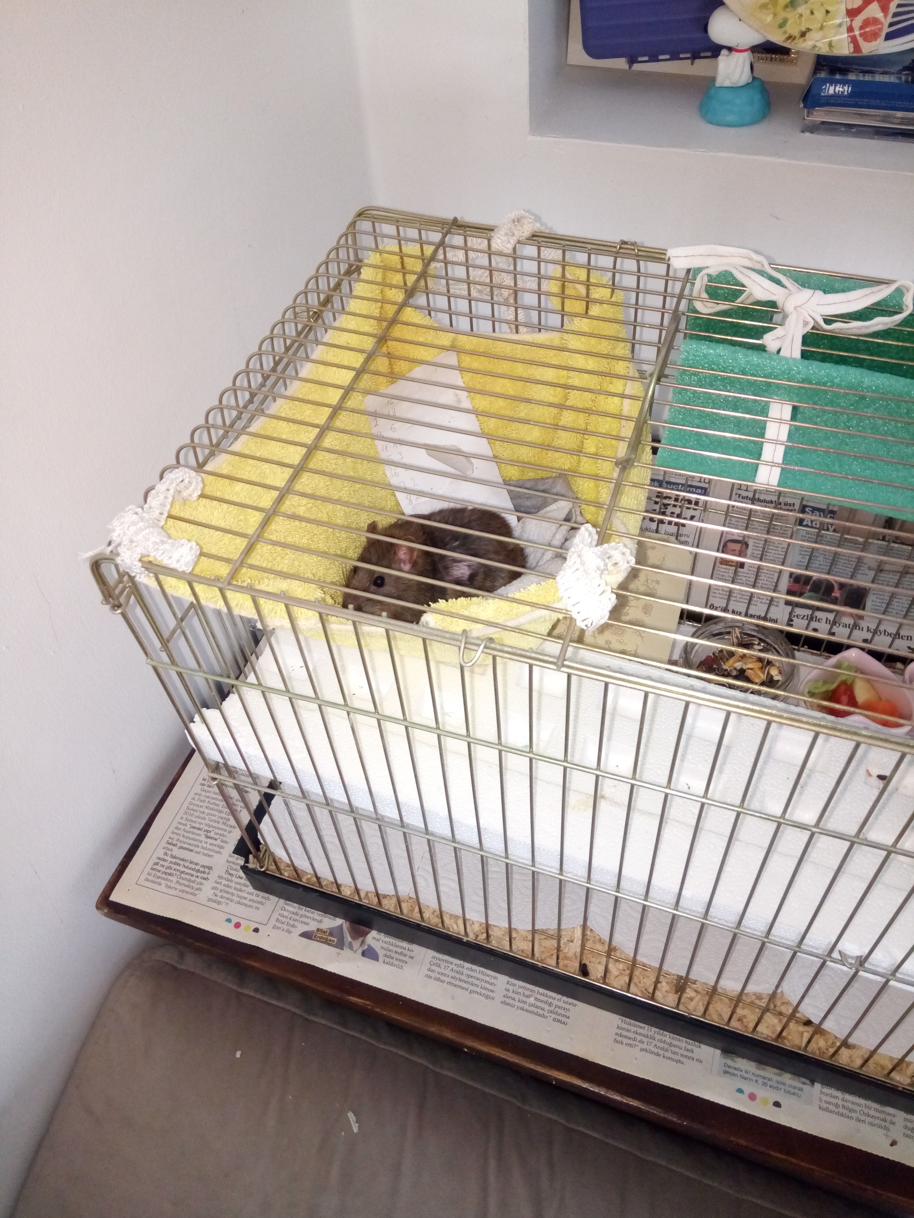 Но только ванная комната ему уже была раньше знакома, он там уже сбегал и несколько суток сидел под унитазом... То есть само место то ему было знакомо, а запаниковал он видимо именно от нашего присутствия, когда прутья клетки нас больше не разделяли. Неужели он до сих пор считает, что мы можем напасть на него и сьесть? Да теперь он вторые сутки в клетке. Он опять большую часть времени, чем до побега проводит в гамачке, и почти не выходит за вкусняшками (я даже подумала, не заболел ли?), но утром сидел у решётки и даже принял орешек от мужа, а кормушки опустошил. Надеюсь всё-таки на пластичность его психики, ведь он ещё ребёнок (судя по весу не больше 3-х месяцев). А скажите, если мы откроем клетку (конечно не сейчас, когда он вновь будет вести себя нормально и успокоится), то не будет ли он стремится сразу убежать и спрятаться? Захочет ли вернуться опять в клетку?