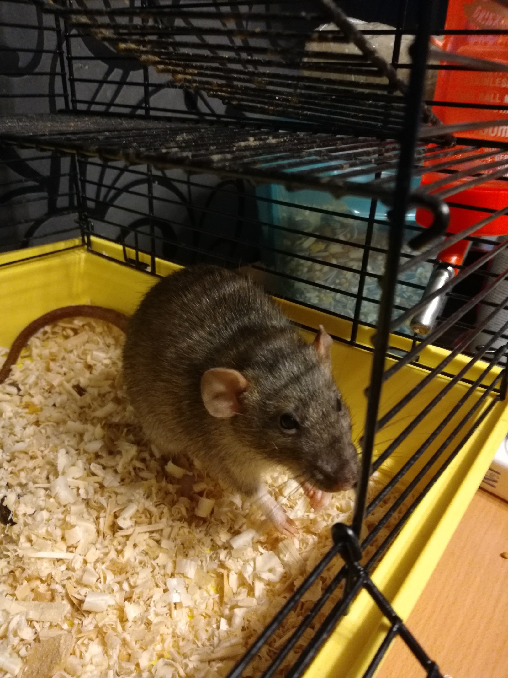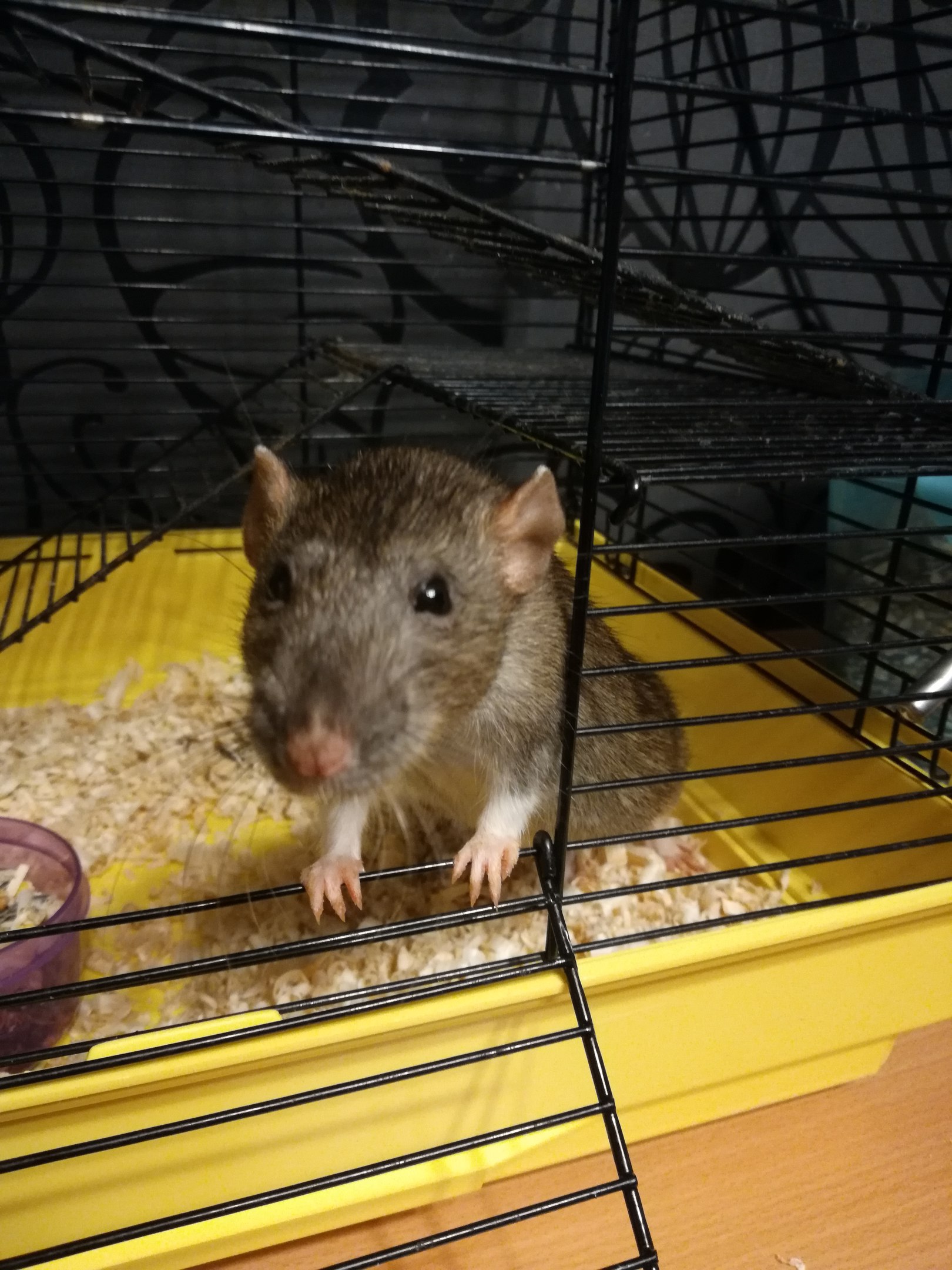 ). Я стала пытаться ее социализировать, сейчас, спустя больше чем пол года, Плотва не прячется, когда я подхожу к клетке, может взять лакомство из руки, поставить на меня лапу,дает залезть в клетку, чтобы досыпать ей еды, проявляет любопытство к людям, но, самая большая проблема так никуда не ушла-покусы. У меня постоянно покусы на руках, хоть в клетку я лезу только в перчатках, да и она, в принципе, остервенело хватает зубами все, что оказывается возле клетки. Всё осложняется тем, что кроме меня, невольными заложниками ситуации являются муж, собака и кот, и если муж с собакой получили пару укусов и больше не хотят вступать в контакт с Плотвой, то кот-то-ли мазохист, то-ли пацифист, но он постоянно тусуется возле ее клетки, спит на клетке, трется об нее, а маленькое исчадие ада не упускает возможности вырвать коту пару клоков шерсти или покусать за лапы, а изолировать их друг от друга в моей однушке-студии не представляется возможным. В силу вышеописанного, Плотву невозможно выпустить погулять, помыть или обработать. Она просто существует в клетке перебираясь из гамака в домик, поесть, и обратно. Я понимаю, что если она заболеет, то я элементарно не смогу, оказать ей помощь и дополнительный уход. Я уверена, что она не безнадежна, и при должных усилиях ее можно социализировать, просто я не крысовод и в мои планы вообще не входило содержать крысу, а тем более, такую своеобразную. Я честно пыталась на протяжении 8 месяцев, но, очевидно,что у меня недостаточно времени/желания/сил/опыта, чтобы содержать не ручную крысу. По этому я очень рассчитываю найти для Плотвы опытного крысовода, который согласится ей помочь и сможет обеспечить нормальную жизнь в компании с другими крысами. Очень надеюсь, что такой человек здесь найдется, Плотве очень тяжело живется в ее одиночной камере.