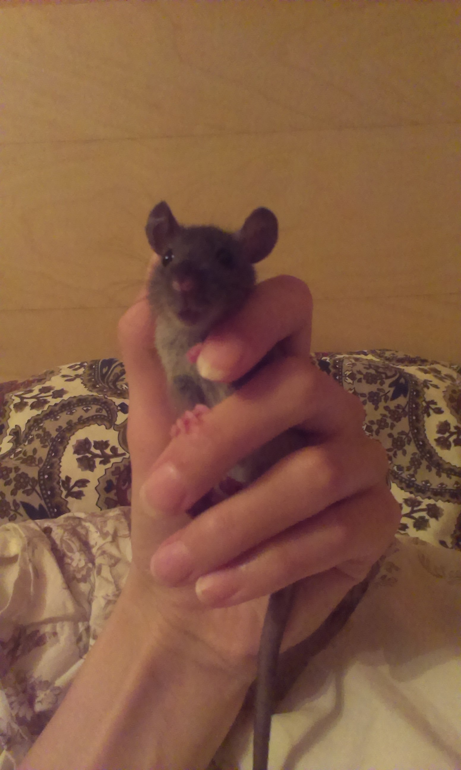 Я все ждала,когда это нежное, трогательное существо включит пасюка, но нам уже 2 месяца, а малыш все еще ласкается, спит в обнимку, играется с рукой,от меня отходит не дальше, чем на 20 (крысиных) шагов.Чуть что не так по его крысиному мнению,сразу в два прыжка оказывается у меня под кофтой. Как-то получилось,что он самый ручной из ручных моих крыс. Парадокс!