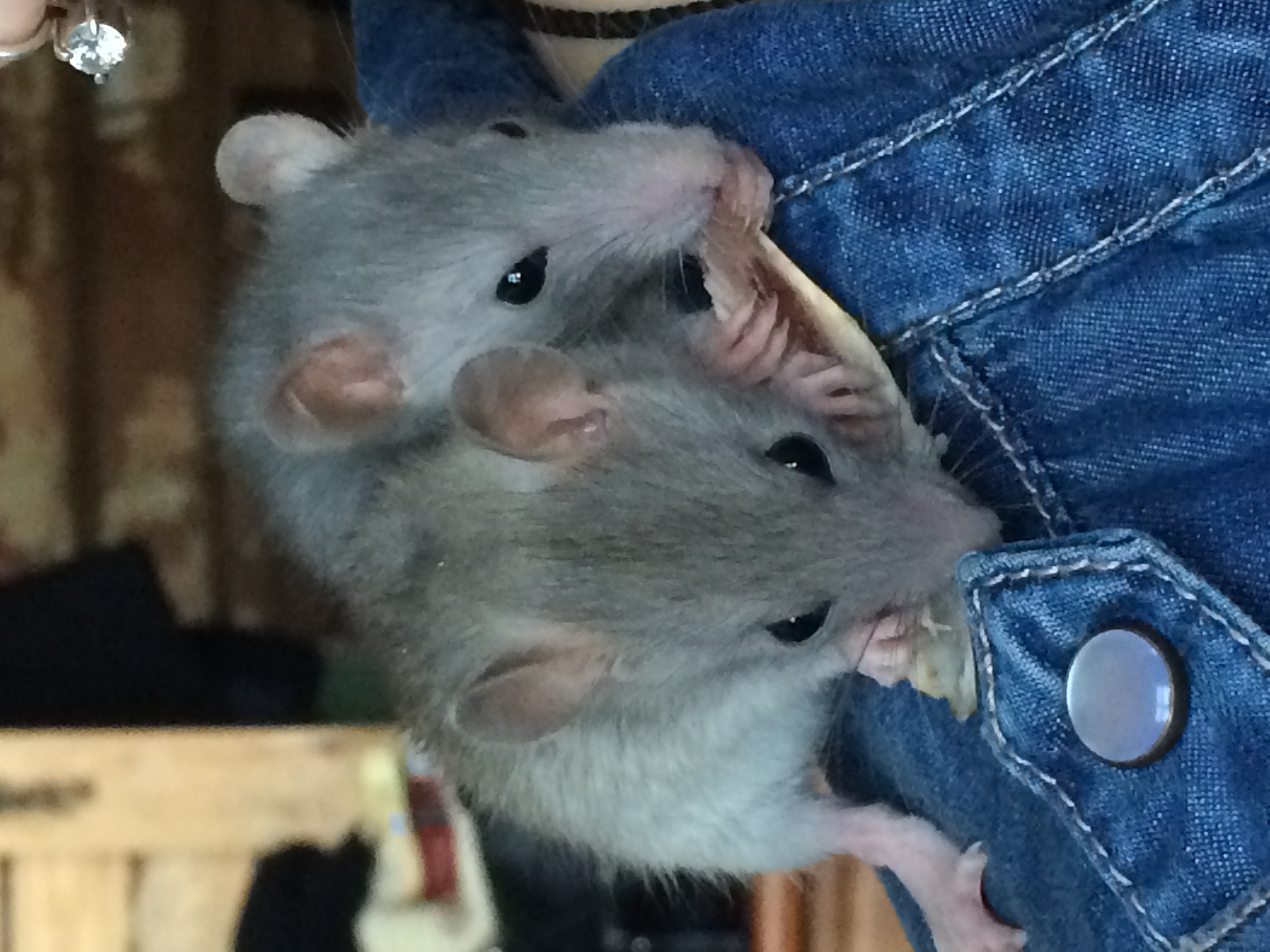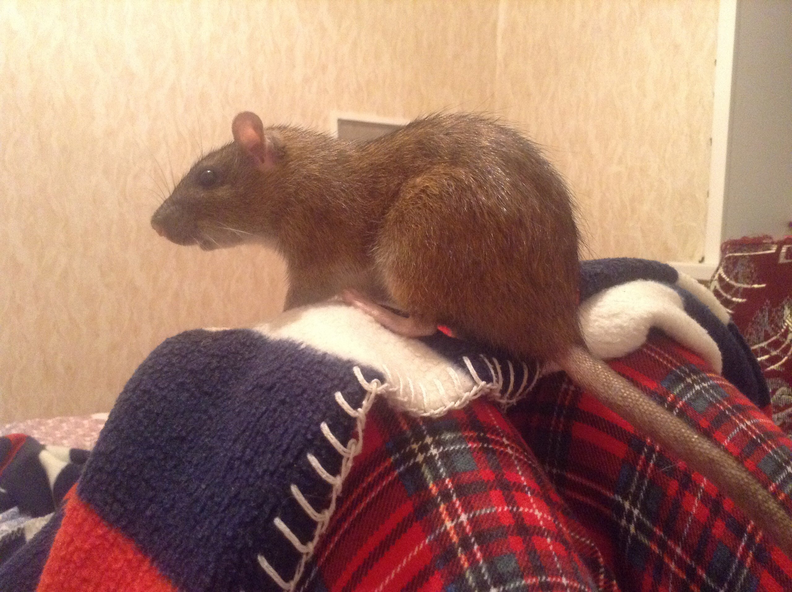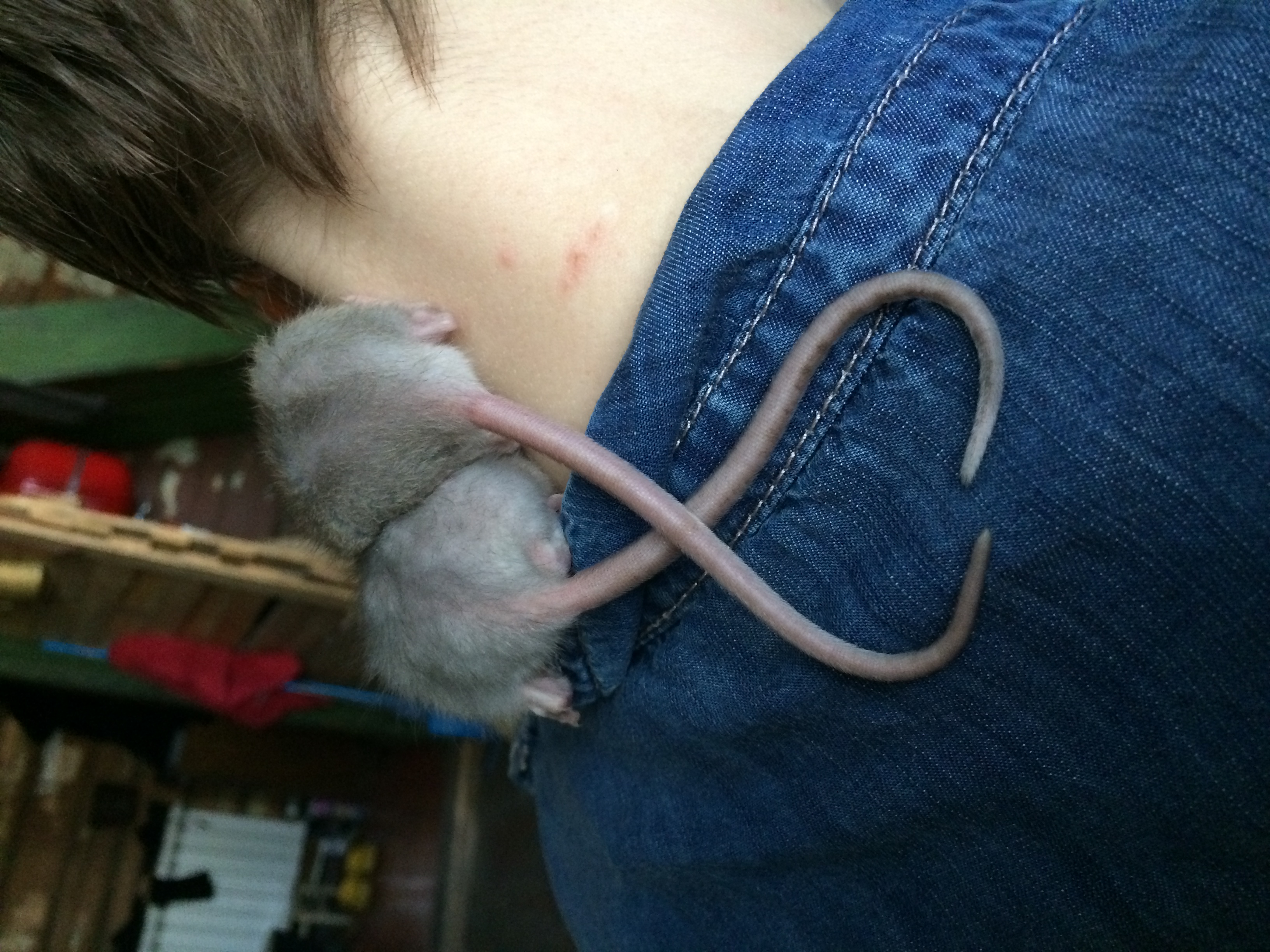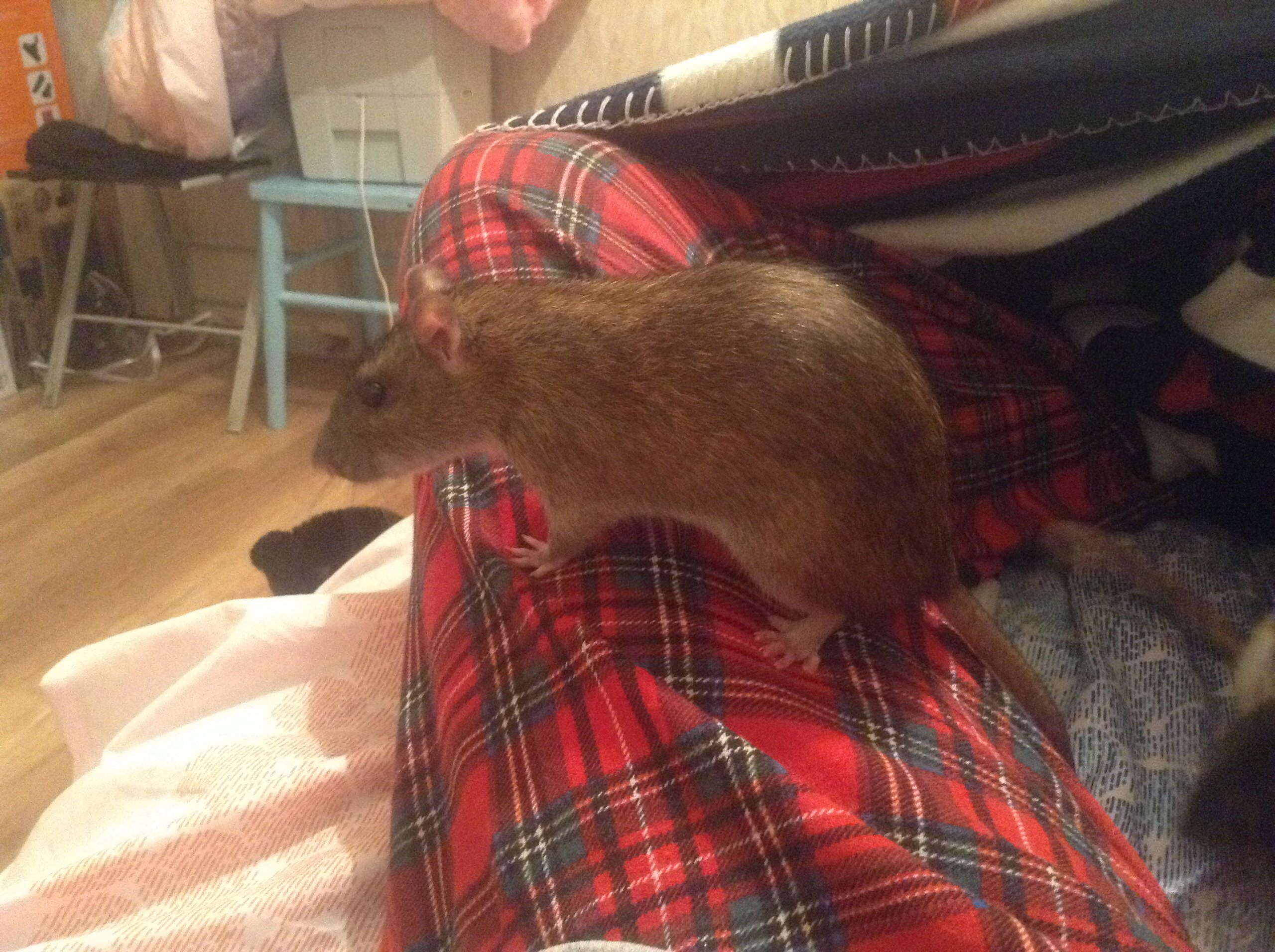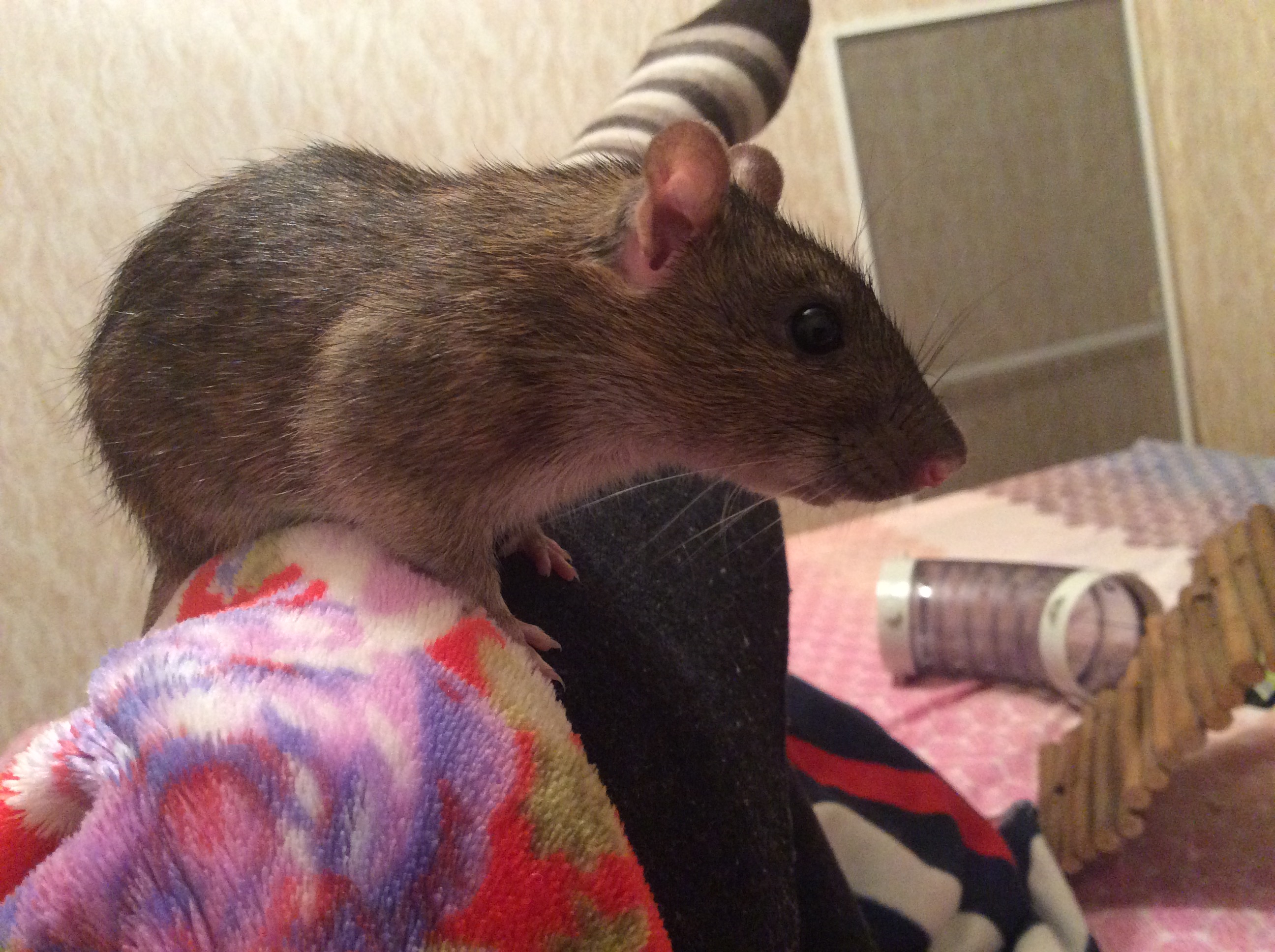 А если на пол смотрит и вниз перевешивается, то ни на какие резкие звуки вообще не реагирует, будто и не слышит, зато стоит мне пошевелится или просто подумать, что я сейчас встану и уйду, крыса мгновенно оказывается на мне