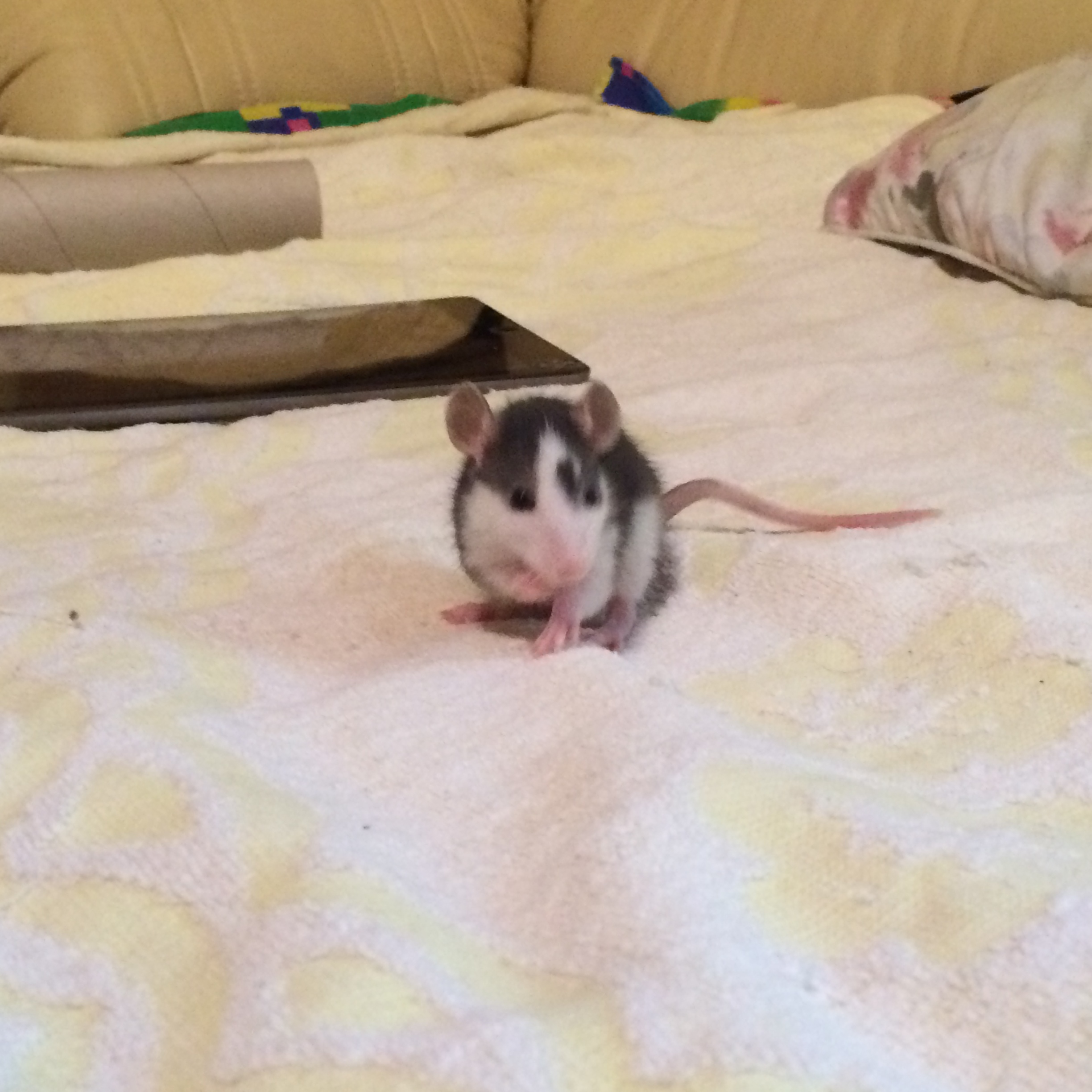 Если хочешь, бери. Ты же мечтала о третьей крысе! Достали малыша, убедились, что это девочка и собрались идти к кассе. И вдруг девушки продавщицы нам говорят , что этот крысёнок забронирован и если его не заберут до завтра, то завтра мы её можем забрать. Ага, это было лучшее, что они могли сказать моему мужу! Он глянул на них так, что все слова и возражения у продавщиц пропали мигом, забрал девочку у них из рук, сунул мне за пазуху и сказал, мол, вы как хотите, а мы пошли отсюда. И со словами что это и будет его подарок мне на годовщину взял меня за руку и пошёл к кассе . В ресторан мы конечно же не поехали. Всю дорогу домой ребёнок судорожно вылизывал меня везде, где только мог достать и заглядывал в глаза. Весила она тогда 39 грамм. Поначалу она ела так, что я начала боятся, не беременна ли она , нервничала и отсчитывала положенные для крысиной беременности дни. Но все обошлось,ттт.