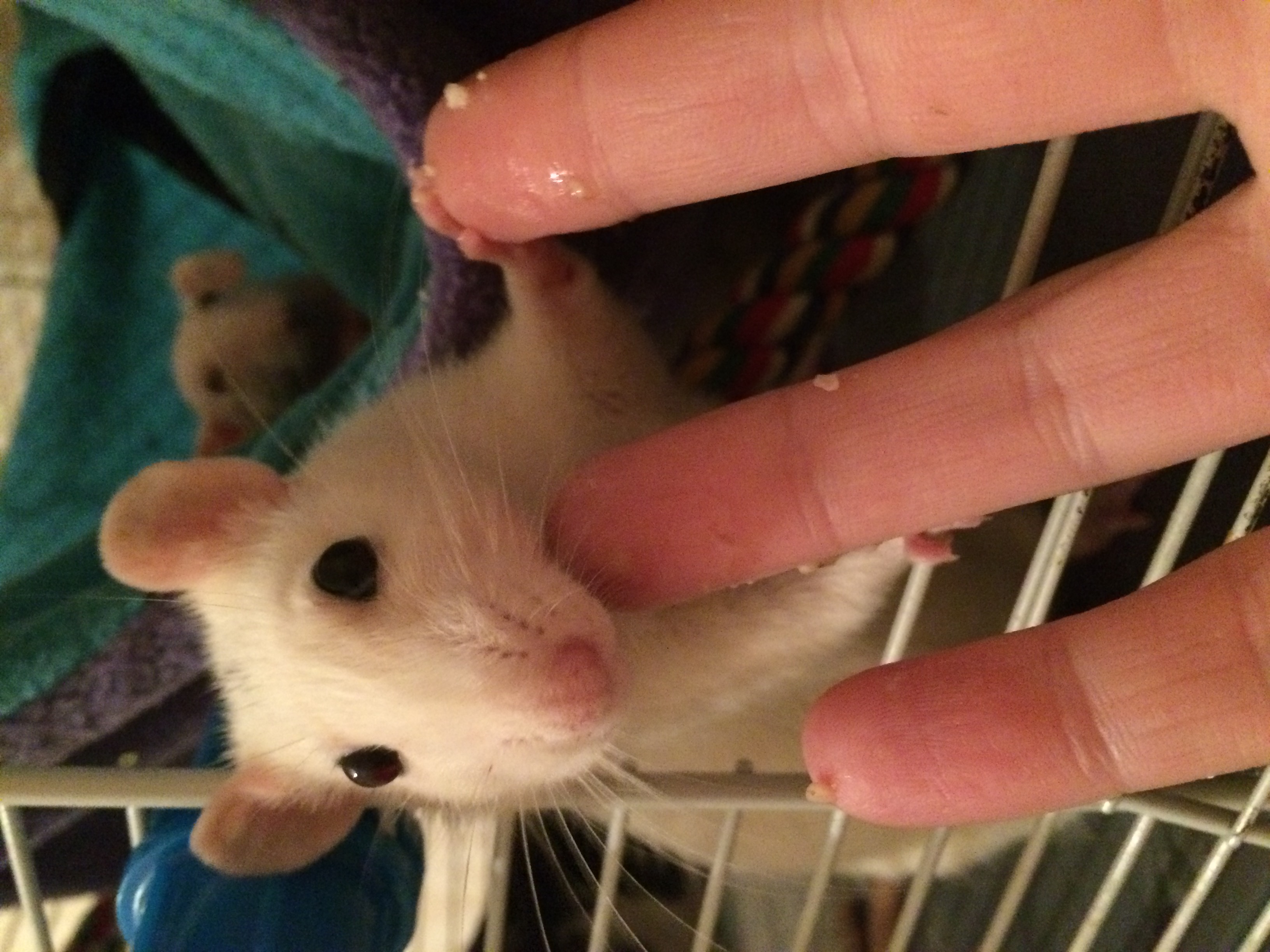 Ая, Аюшка, Аечка, зайка моя. Второе имя этой крысы - Нежность. К моменту её появления у меня уже были Цуна-Цуняша и милая Миси. Наступил день годовщины свадьбы и мы поехали отмечать это дело в ресторан, но у крыс кончился минеральный камень и я попросила мужа заехать в зоомагазин за ним. Заехали, купили и тут я увидела кучу крошечных крысят в аквариуме, подошла посмотреть и вдруг один из них встал на задние лапки и так на меня посмотрел... А я посмотрела на мужа. Муж посмотрел на нас и сказал :