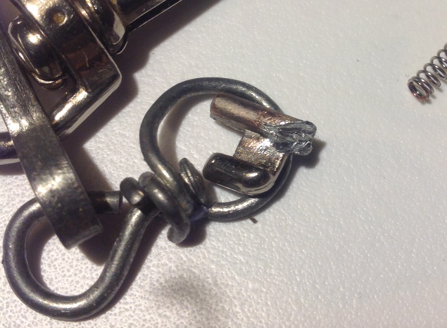 У меня карабины другой конструкции - их надо оттягивать пальцем, а Пончику это неудобно. Он по чуть-чуть подрезает кончик карабина. Вот, отнял у него трофей - фото, правда, не очень, но видны следы от подрезки зубами. Сейчас он понял, что проще подрезать не сам крюк ( он толще), а шпингалетик - он намного тоньше. Работа идёт намного быстрее. Пончик уже почти закончил подрезать два новых шпингалета, которые фиксируют сейчас парадный вход. Ещё два-три дня работы и он сможет открыть дверцу.