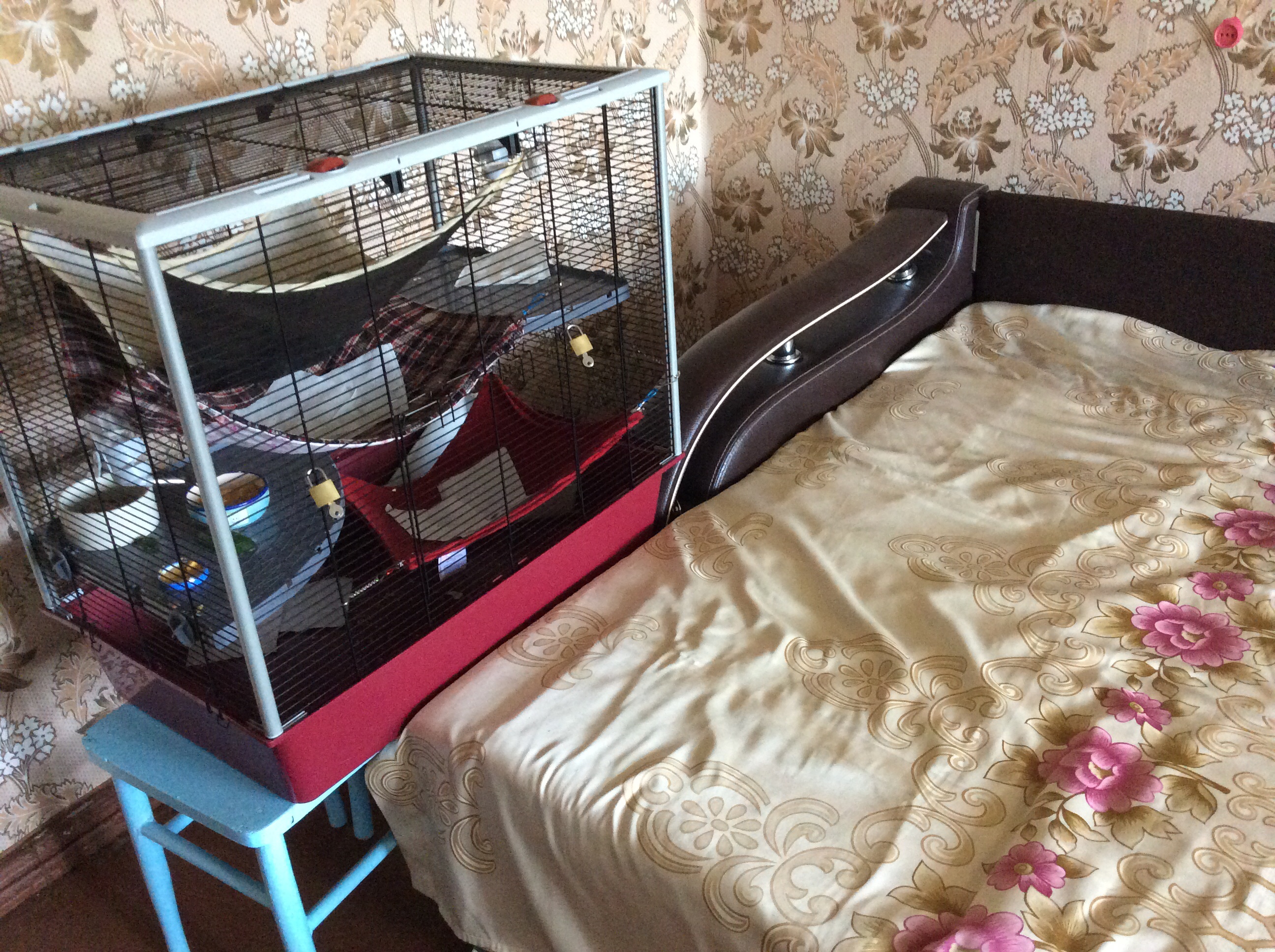 Ура! Ура! Ура! Сегодня мы переехали в квартиру. На 100 км дальше от цивилизации и пока без ремонта, но мне здесь будет спокойнее за Пасеньку. Последние три дня я пыталась ее выгуливать на диване в старом доме и каждый раз это было не более пяти минут, потому что она сразу устремлялась к краю и очень опасно заглядывалась на пол. Теперь в нашем распоряжении комната без щелей и дыр, с плотно закрывающейся дверью. Из мебели большой диван и две табуретки на которых стоит клетка. Если диван придвинуть вплотную к стене, то там образуются очень соблазнительные щели и я решила выдвинуть его в середину комнаты. Может это ее остановит от побега? А может мне его открытой частью, наоборот к стене придвинуть? Пока Счастье боится и не идет даже за пазуху и прячется под подружек. Первый раз такое вижу, прямо под них подныривает и мордаху прячет, типа я не вижу, значит и нет ничего