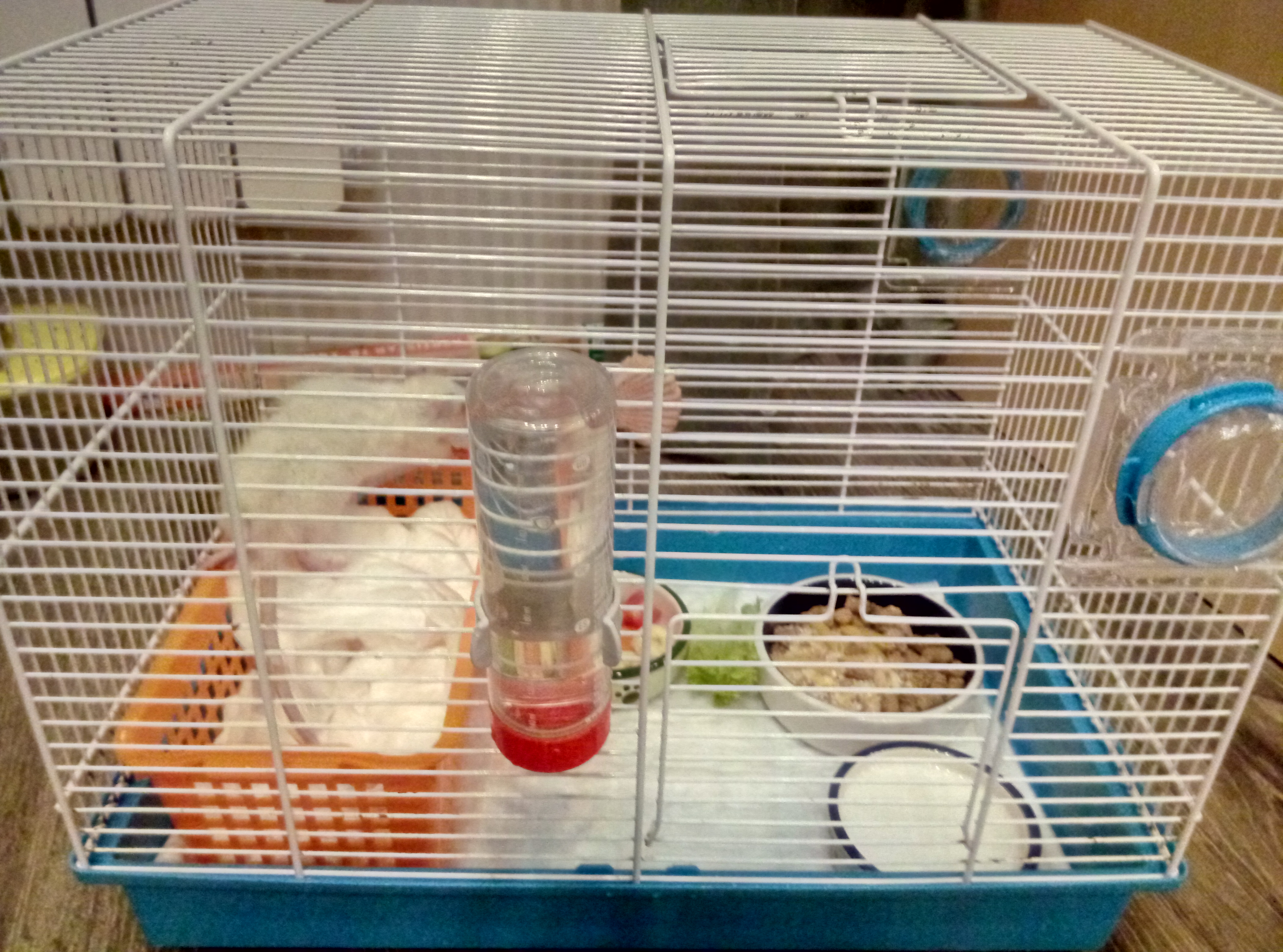 Через какое-то время у меня началась аллергия (которая раньше не проявлялась). Противоаллергенные не помогли, и я отдала мальчиков вместе с клеткой и всеми амунициями, запасом корма и пакетом наполнителя знакомой. Вскоре она купила им новую клетку, а мою вернула. Я попрошу ее выслать свежие фото, как только найду контакт.