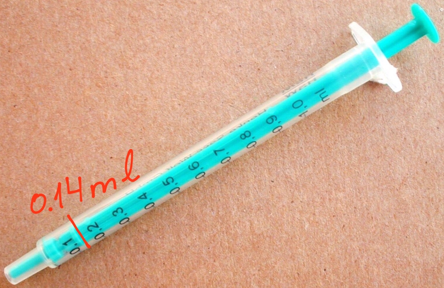 В инсулинке 1мл ровно. А 0,14мл это почти в 10 (!!!) раз меньше 1 мл. - это 7 делений инсулинового шприца, где 1 деление равно 0,02мл.