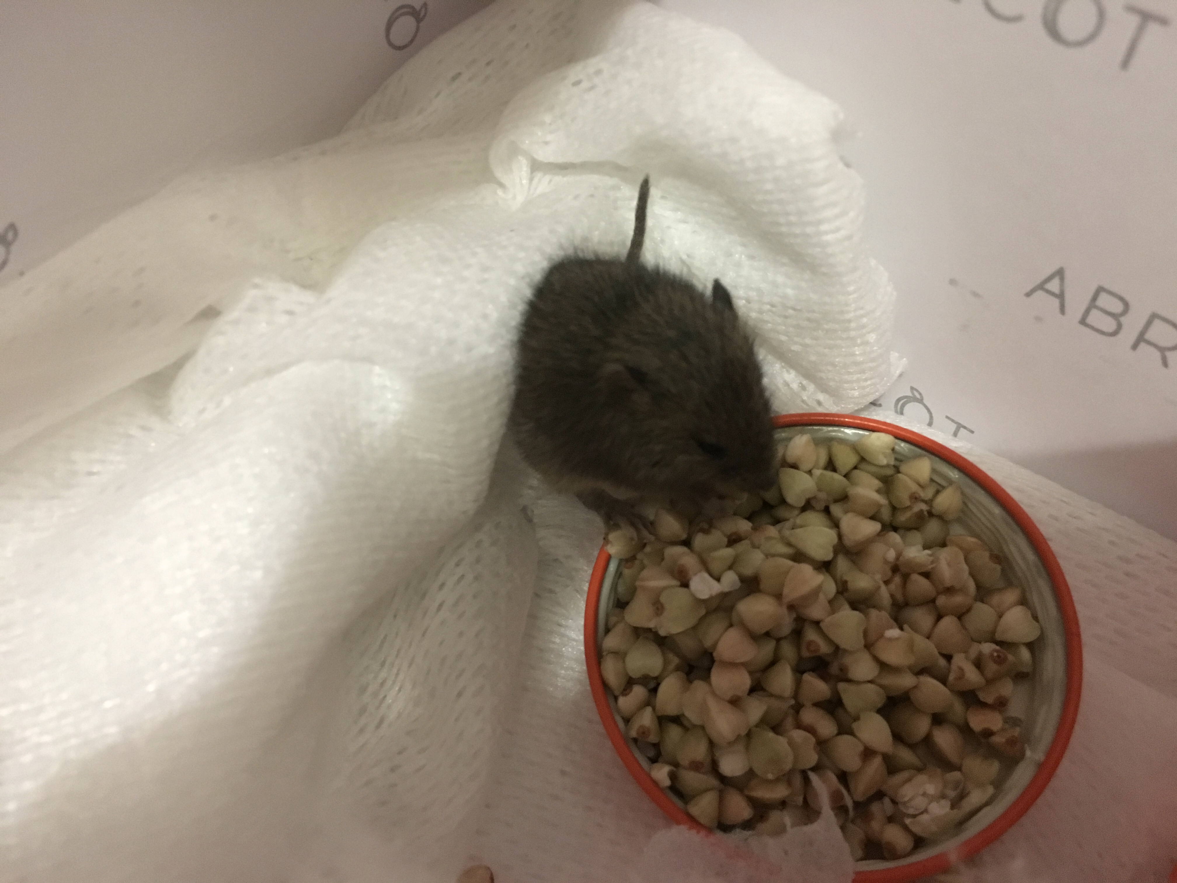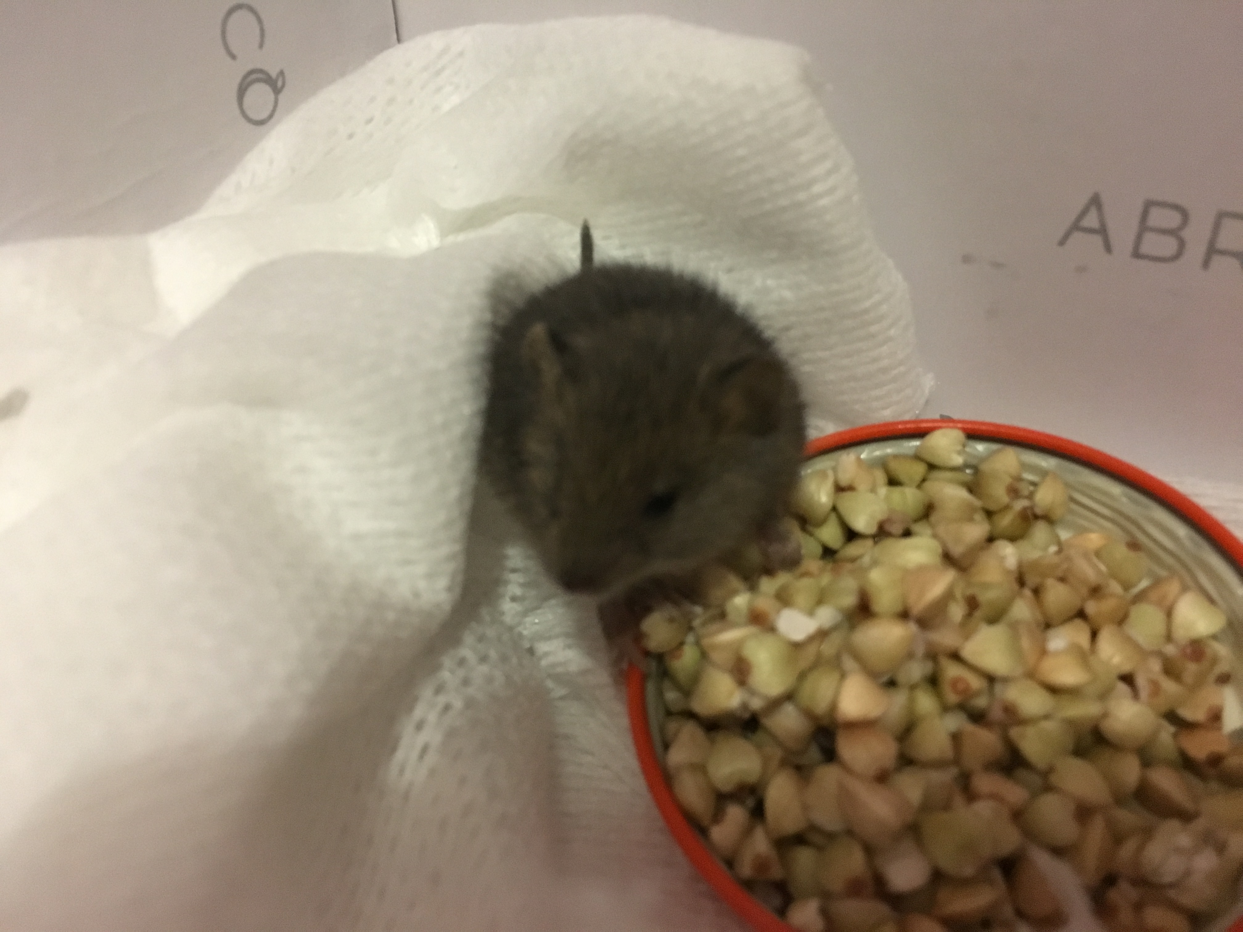 Уже купили специальный корм для мышек, размочили водой и дали молока. Вечером купим ему либо террариум, либо клеточку, а то в коробке ему явно не комфортно.